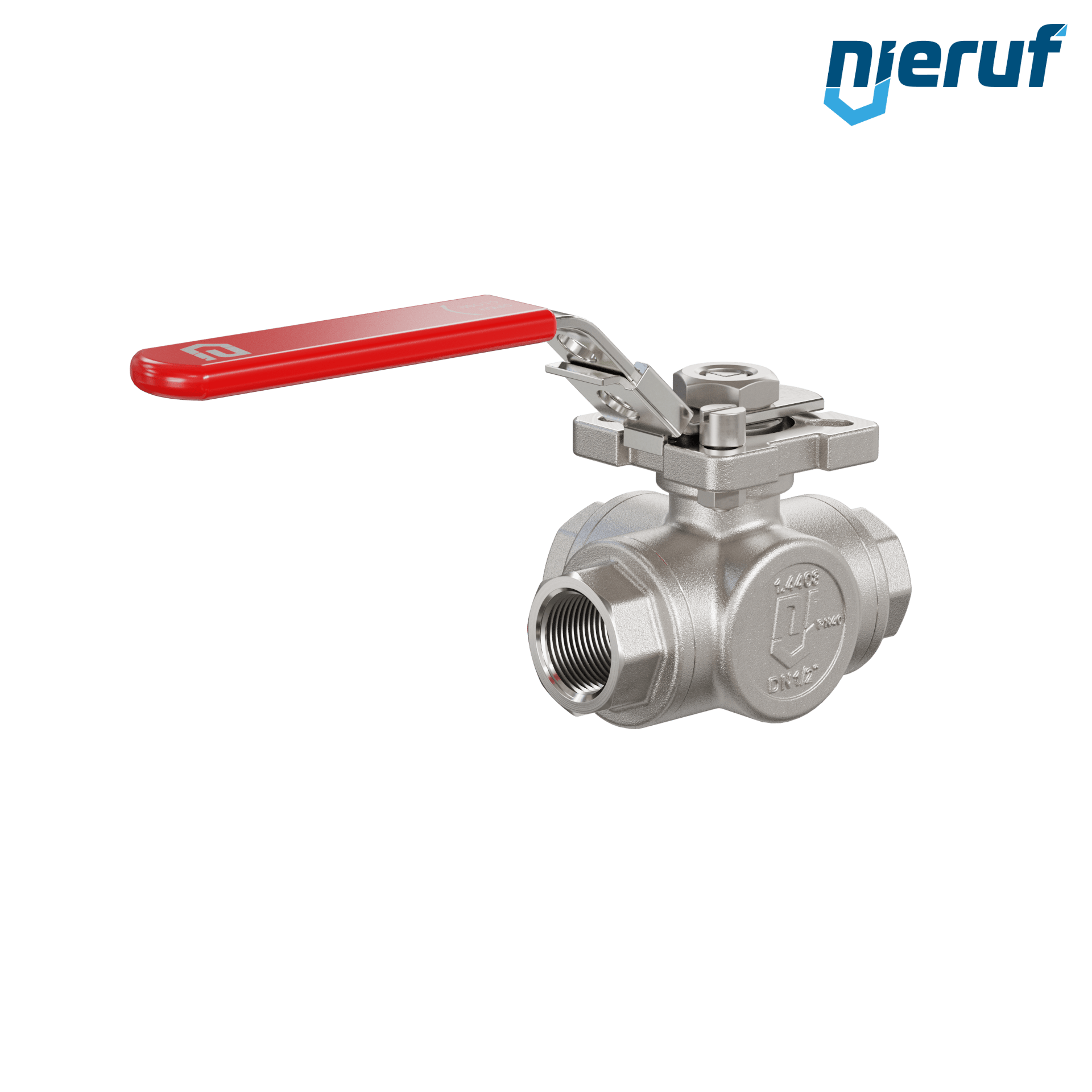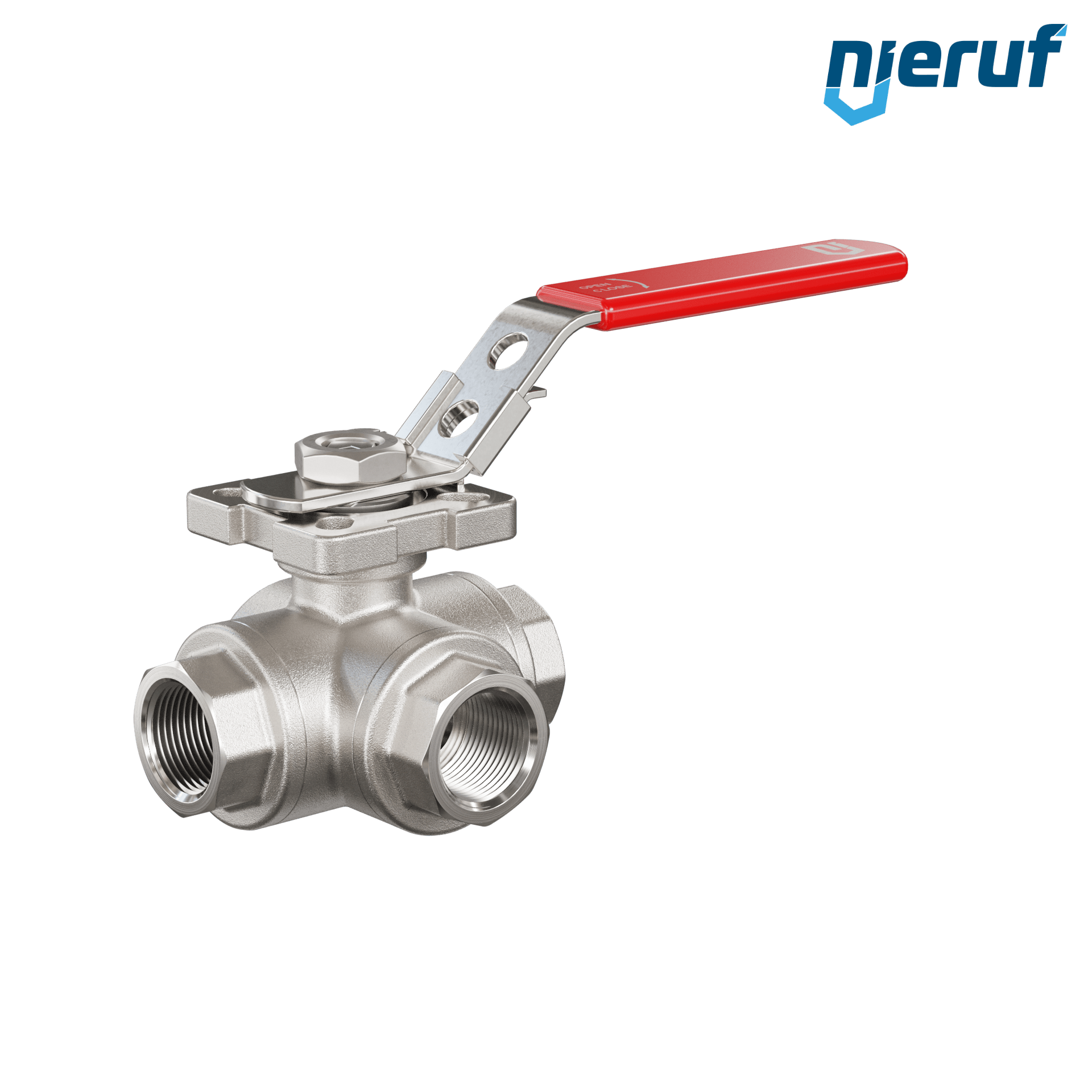 | Produktmerkmale | Dreiwege-Kugelhahn aus Edelstahl mit Stopfbuchse und schwimmender Kugel mit L-Bohrung |