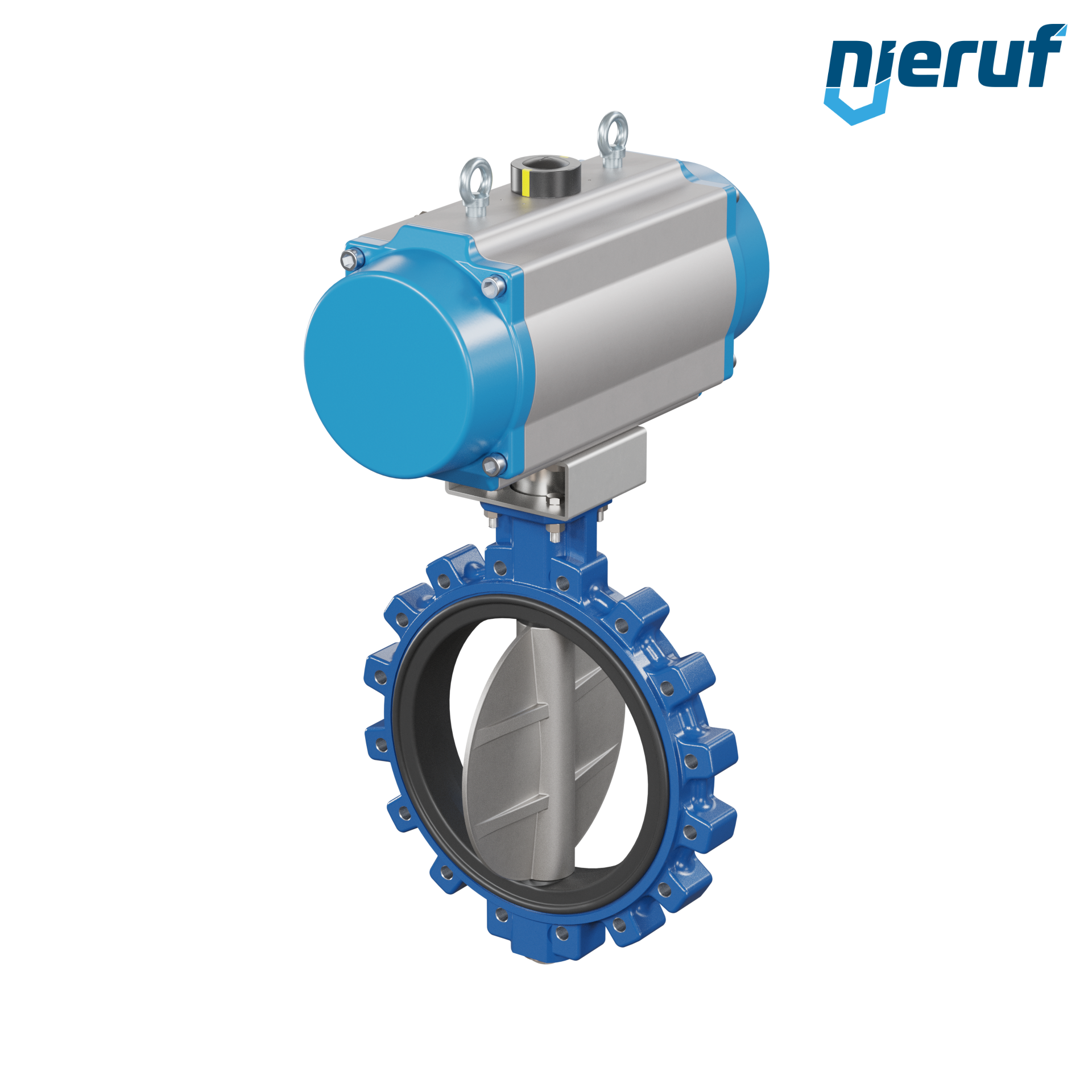 Absperrklappe DN 350 mit Gewindeaugen Gehäuse aus Sphäroguss mit pneumatischer Schwenkantrieb einfachwirkend federöffnend Manschette aus NBR-70-schwarz DVGW Gas