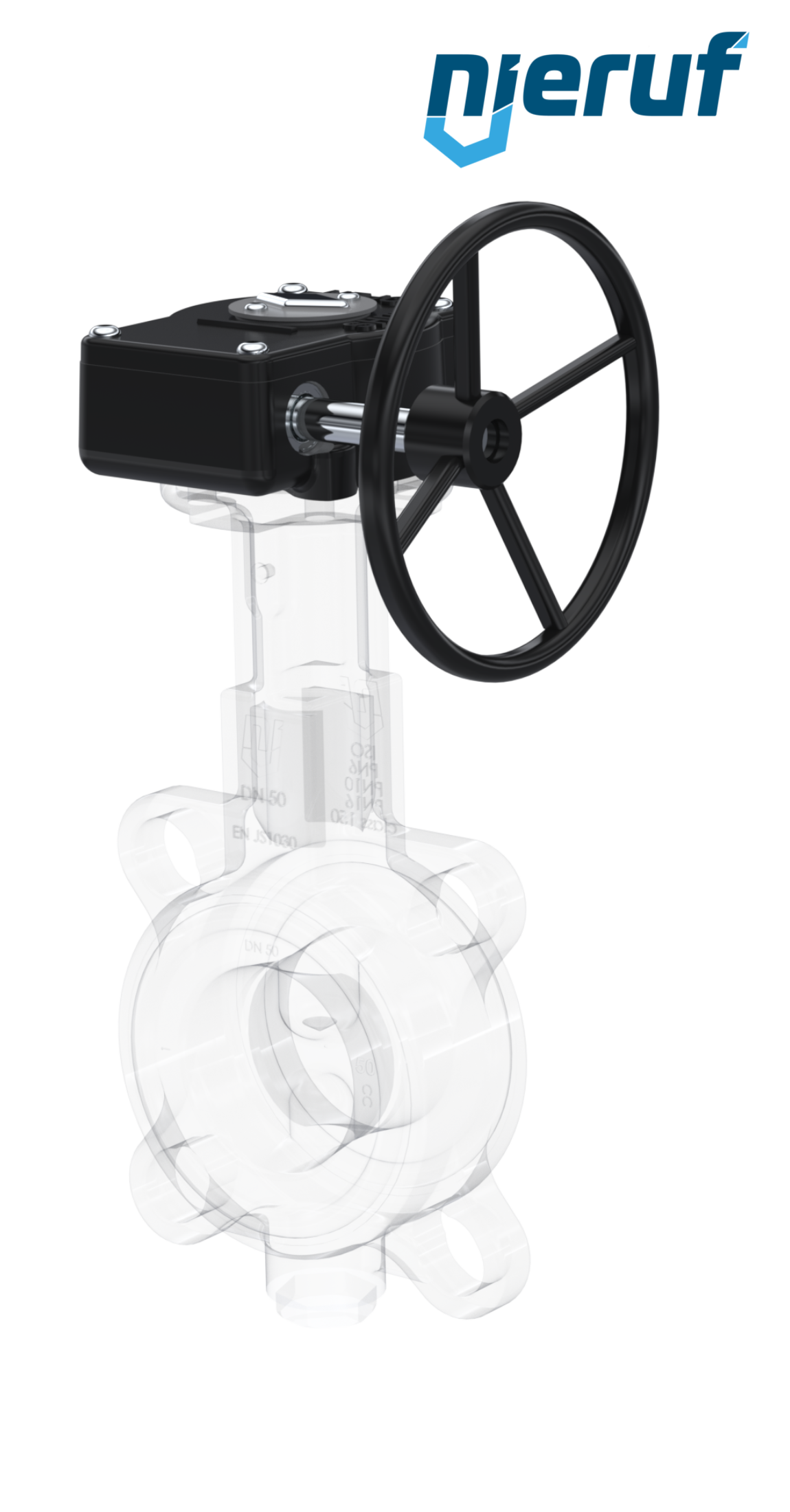 Absperrklappe DN 40 PN6-PN10-PN16 & ANSI150 mit Zentrieraugen aus Sphäroguss mit Schneckenradgetriebe NBR-70-schwarz DVGW Gas