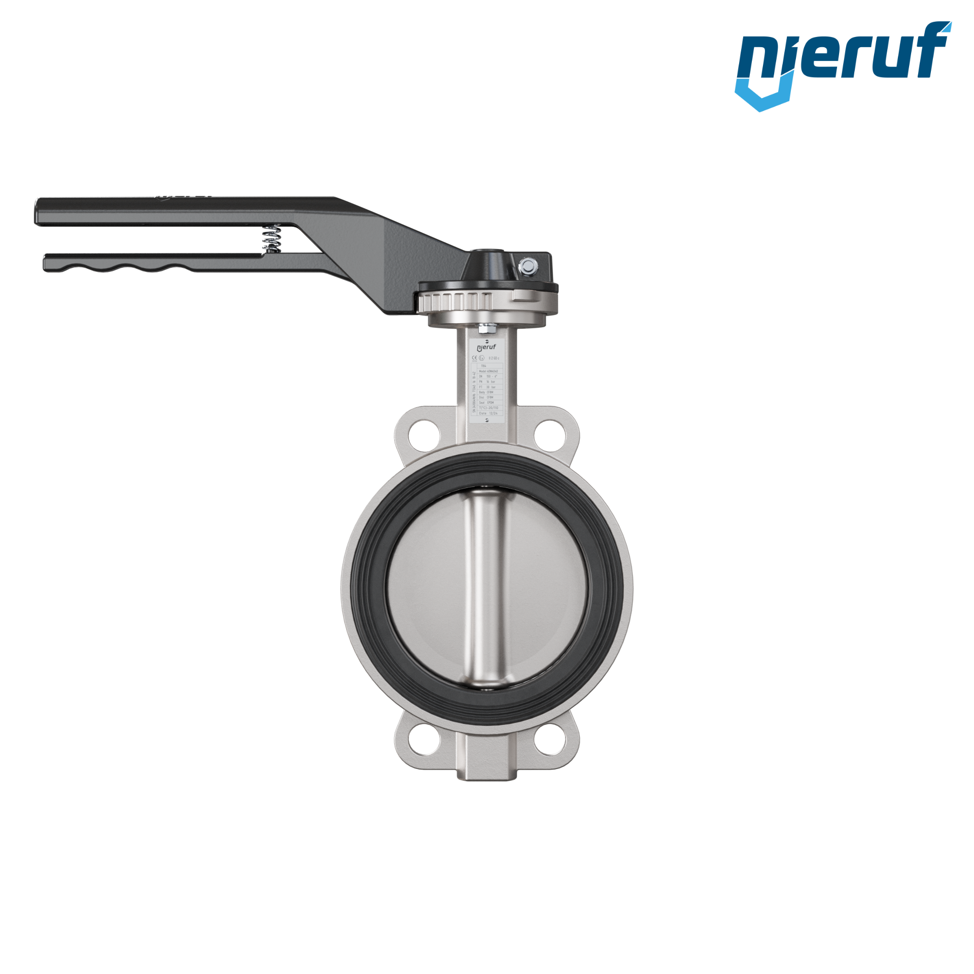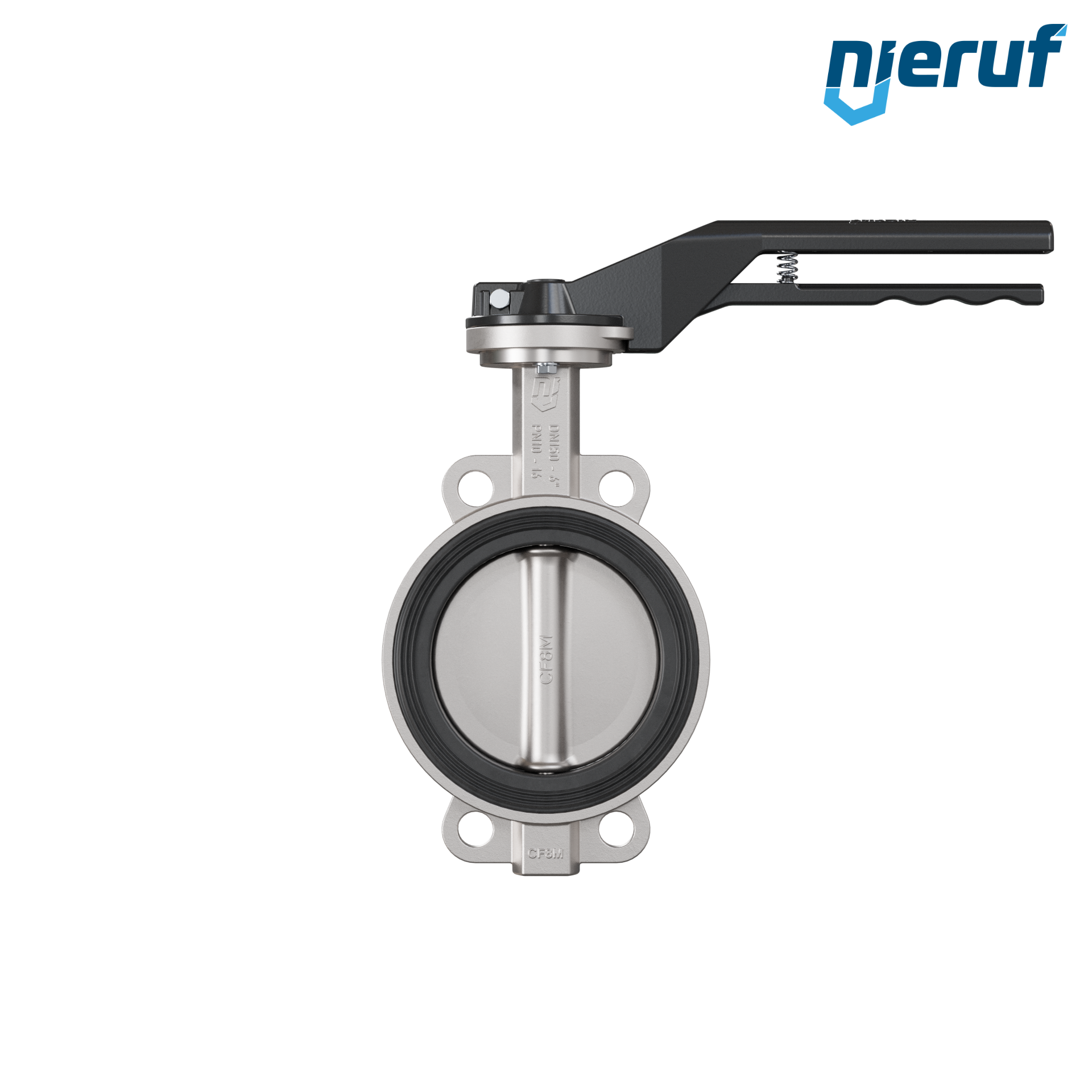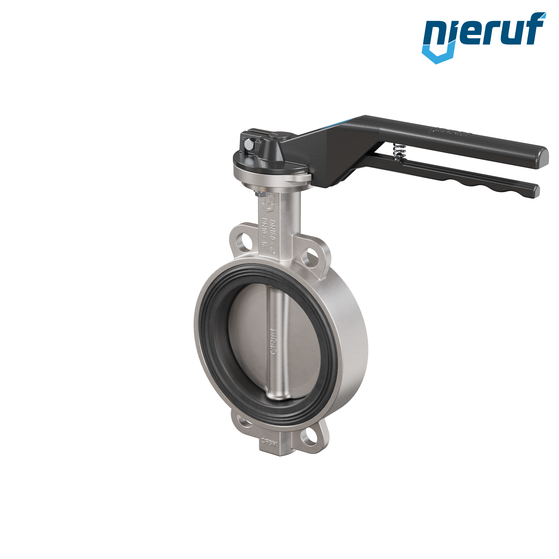 Edelstahl-Absperrklappe DN 150 PN16 mit Zentrieraugen Gehäuse aus Edelstahl 1.4408 Klappenscheibe aus Edelstahl 1.4408 mit Handhebel und Dichtung aus EPDM