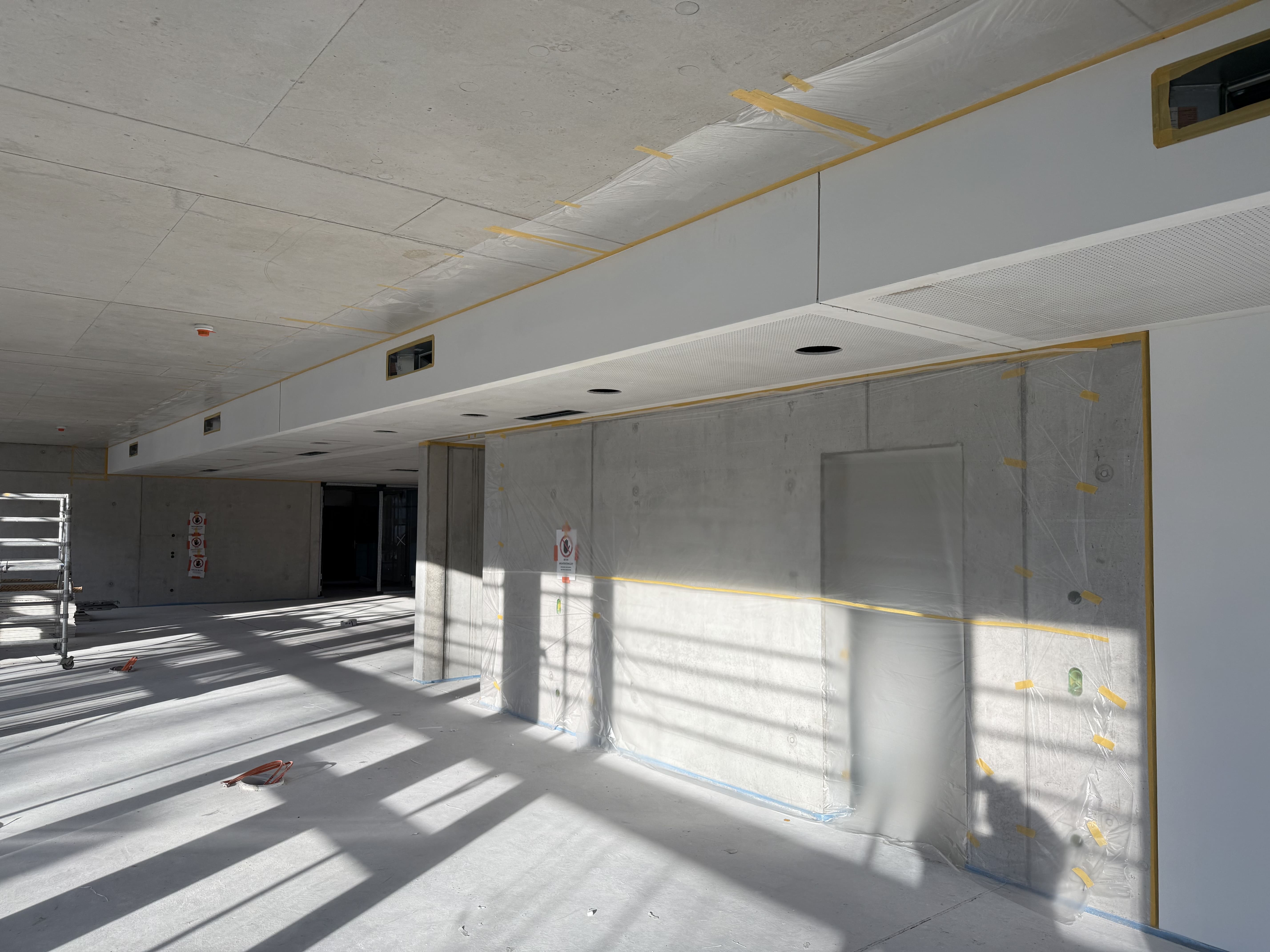 Im Dezember wird es auf der Baustelle etwas ruhiger – der Innenausbau geht dennoch kontinuierlich weiter. Im Erdgeschoss wird die Abhangdecke zunehmend ersichtlich und gibt bereits einen guten Eindruck davon, wie die Räume später wirken werden.