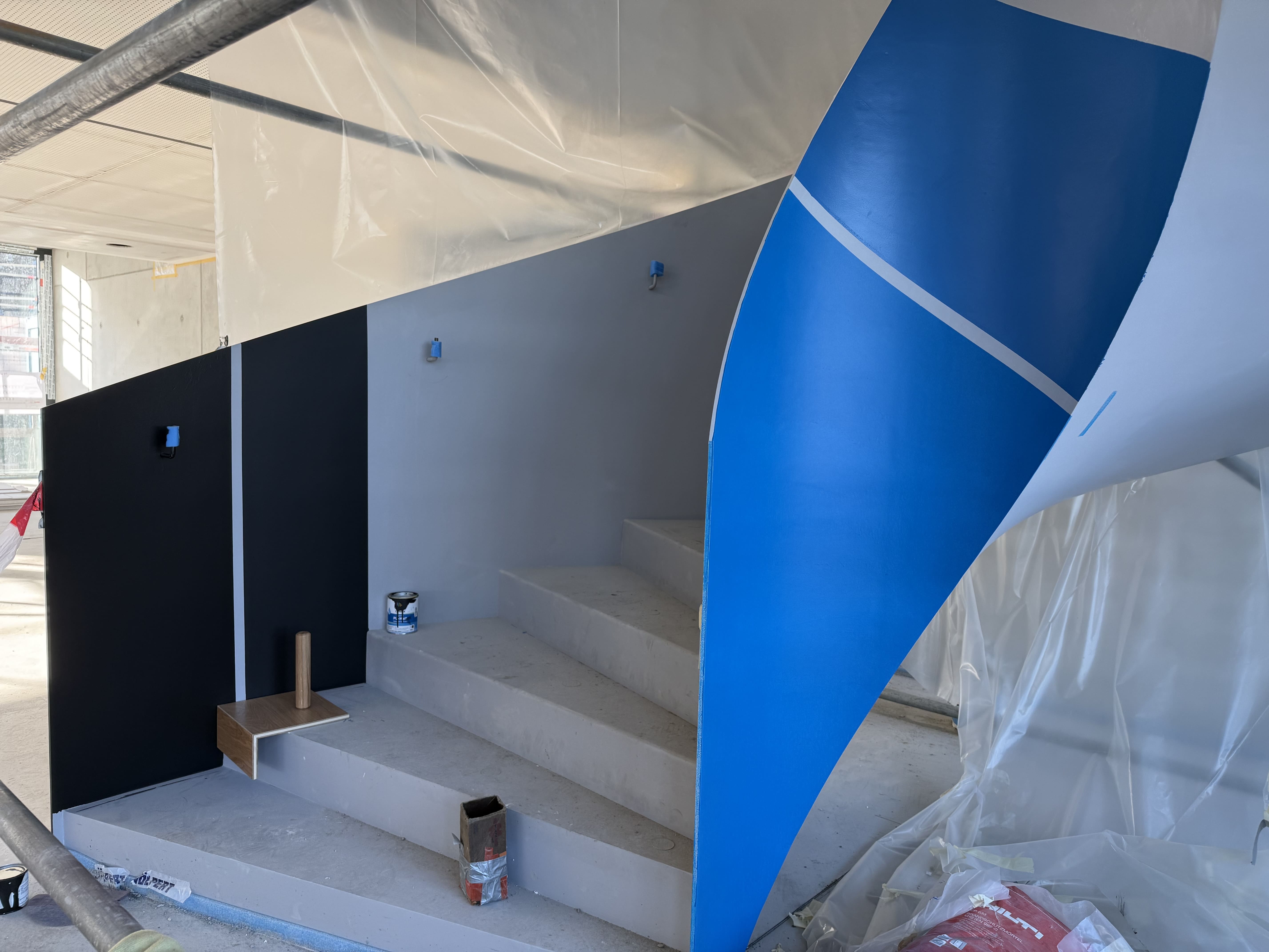 Ein weiteres Detail steht noch zur Entscheidung an: Die finale Farbe der Treppe wird aktuell anhand von Mustern festgelegt – ein wichtiger Schritt, um dem Innenraum seinen endgültigen Charakter zu verleihen.