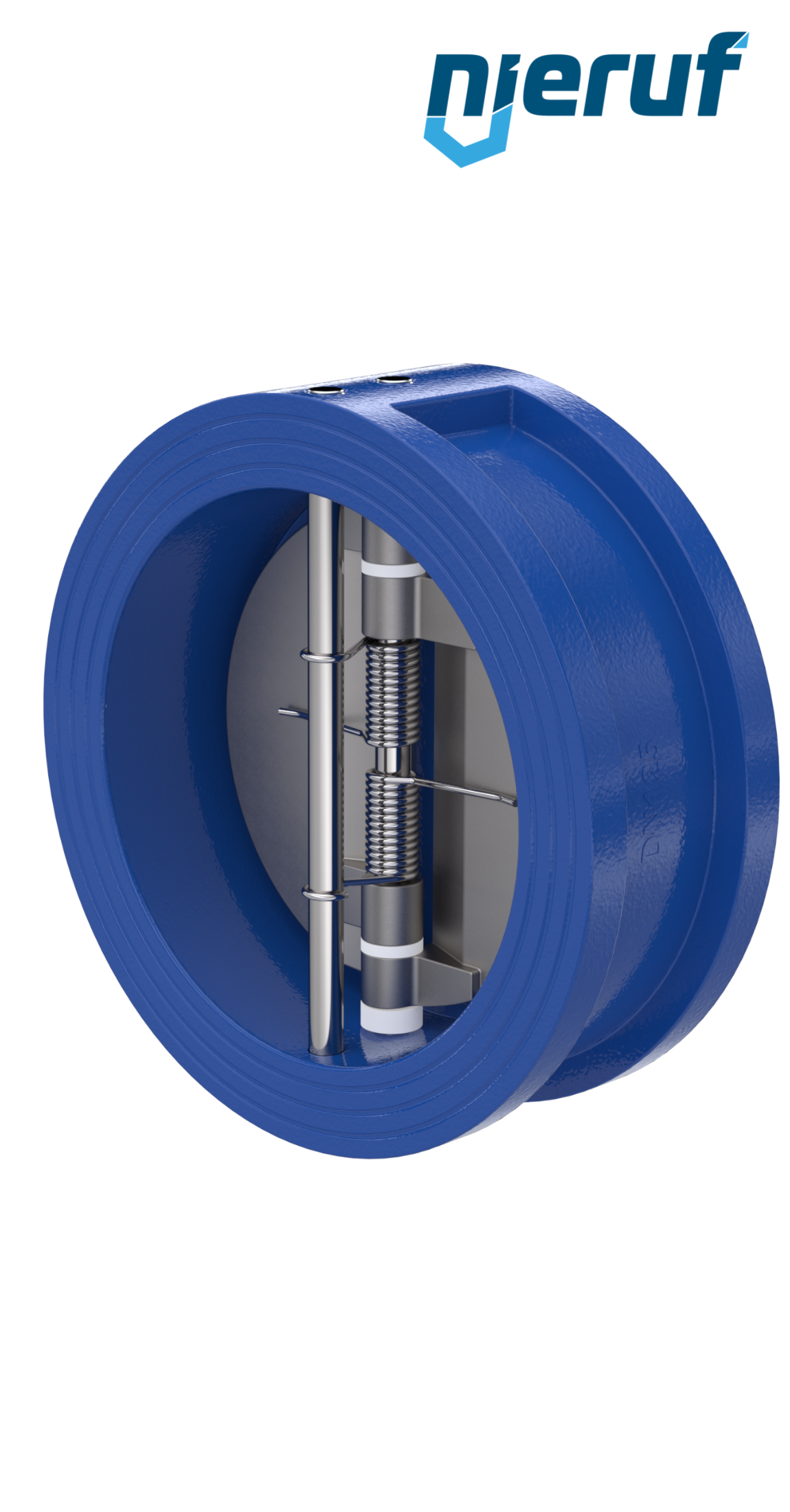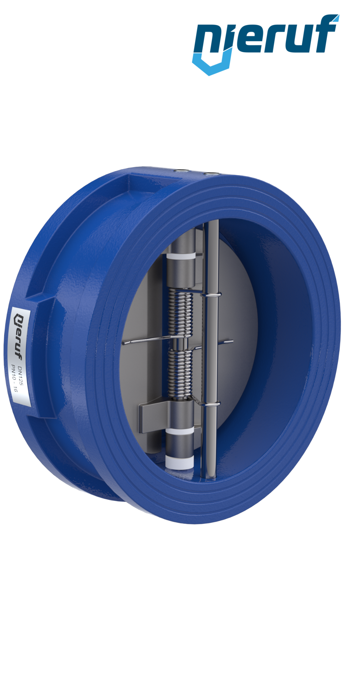 Doppelflügel-Rückschlagklappe DN125 Dichtung FKM (Viton) PN 10/16 DIN EN 1092-1 Form B, Gehäuse aus GGG40 epoxid-beschichtet blau 180µm