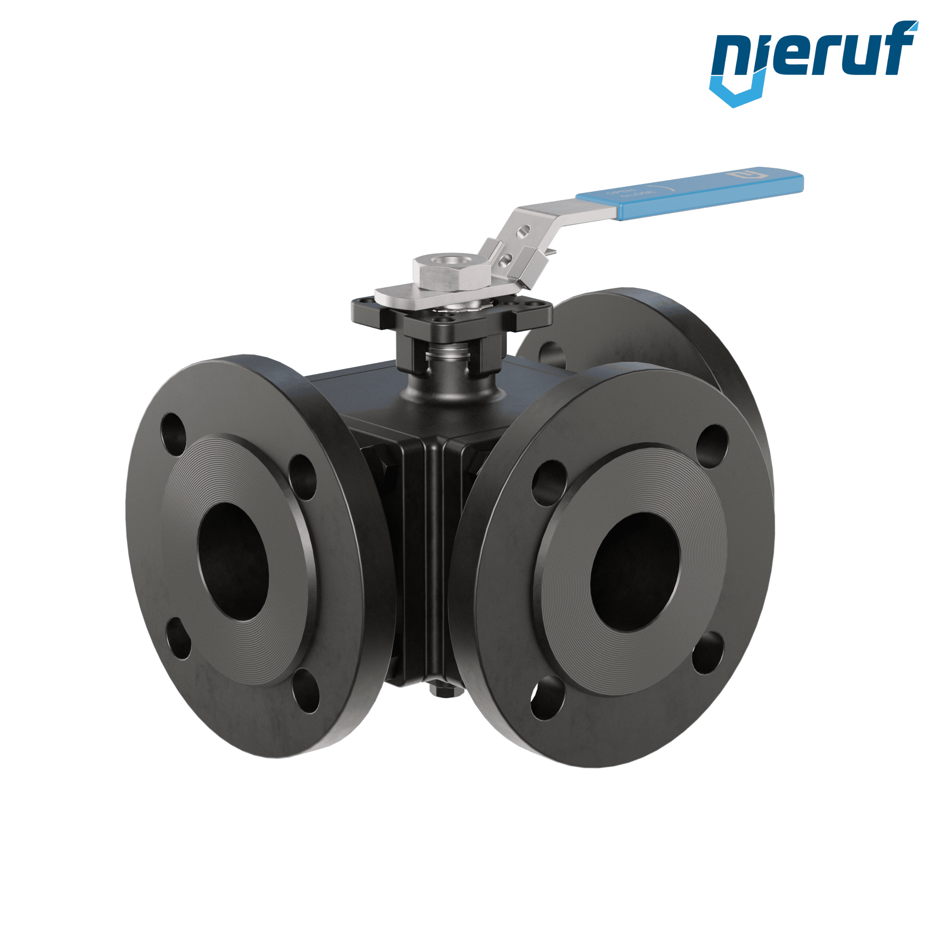 Dieser hoch qualitative dreiwege-Flanschkugelhahn aus Stahlguss mit negativer Überdeckung und Montageflansch nach DIN ISO 5211 hat folgende Zulassungen: PED 97/23/EG, Kategorie 3 Modul H, TA-Luft 2002. Dieser Kugelhahn hat eine L-Bohrung (L=1)