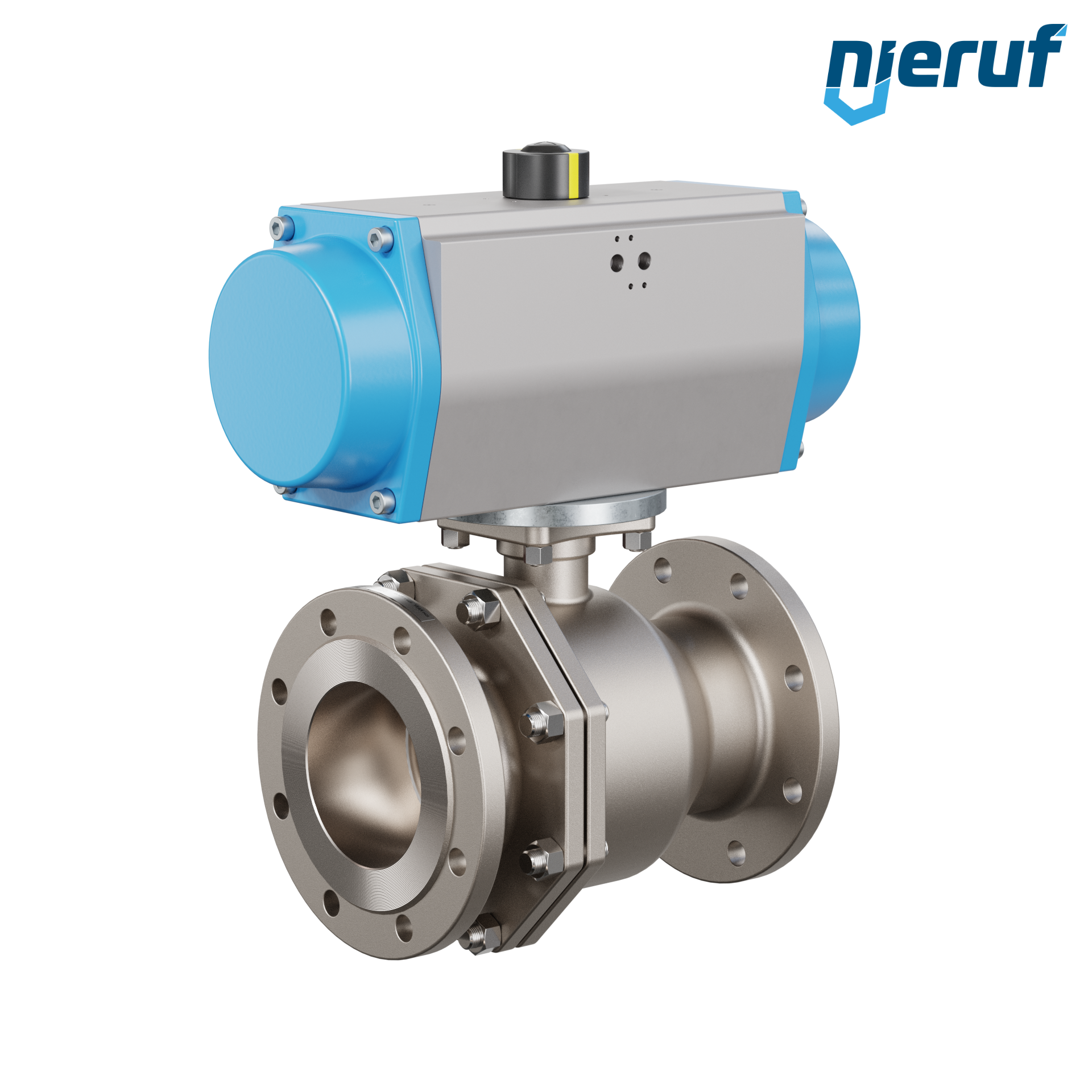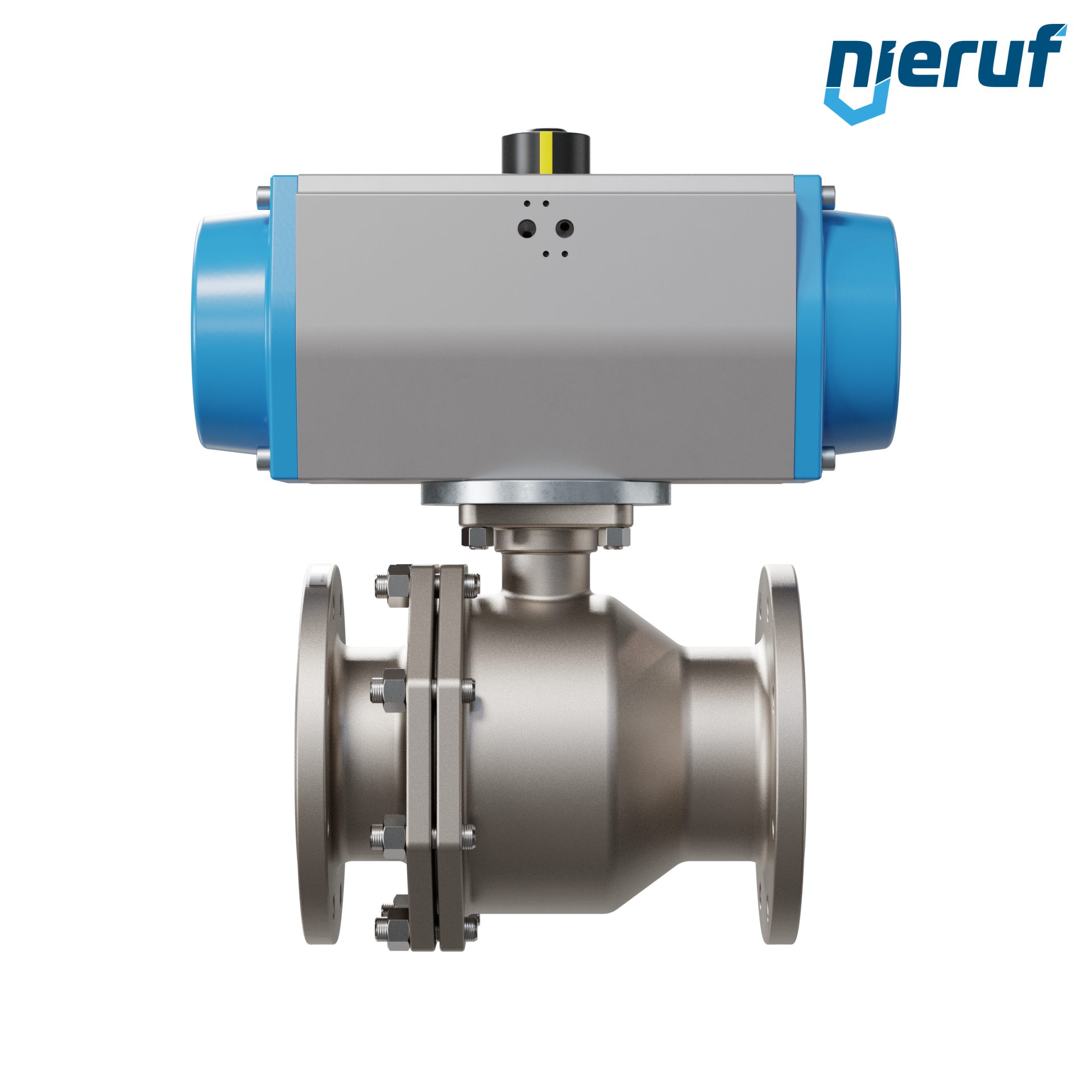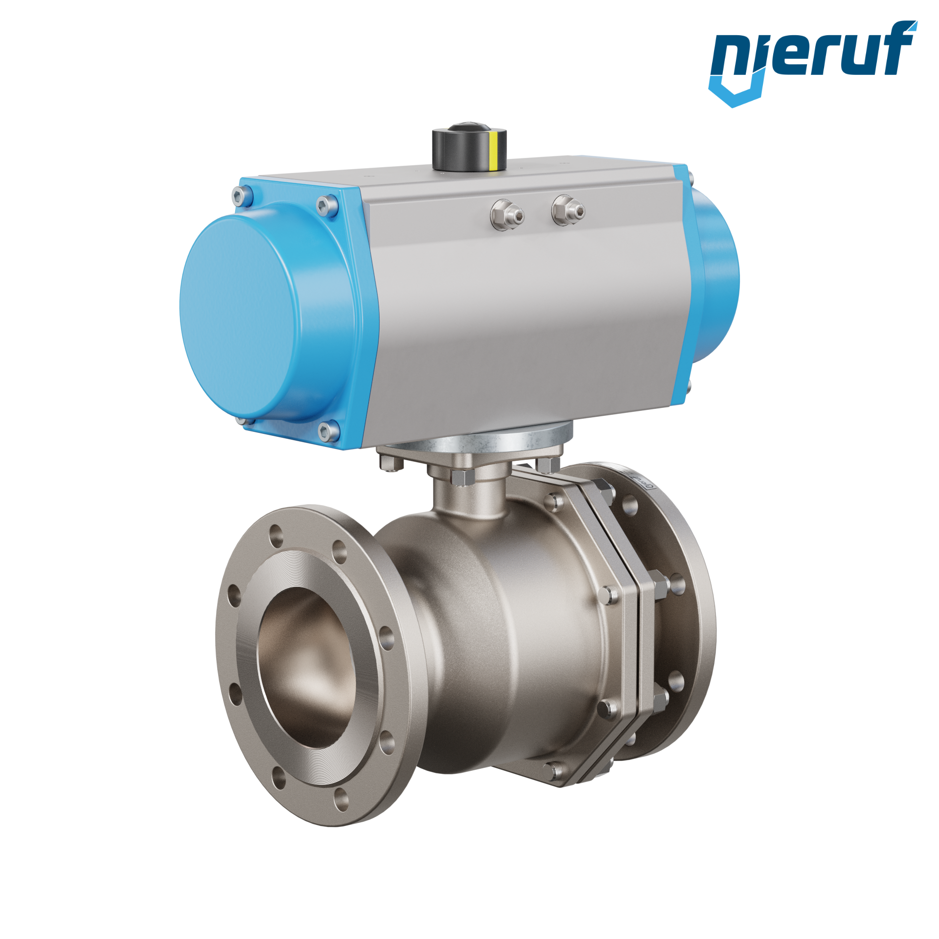 Für diesen hoch qualitativen Automatik-Muffenkugelhahn aus Edelstahl mit pneumatischem Drehantrieb (GS = einfachwirkend) ist keine Brücke und kein Mitnehmer notwendig.