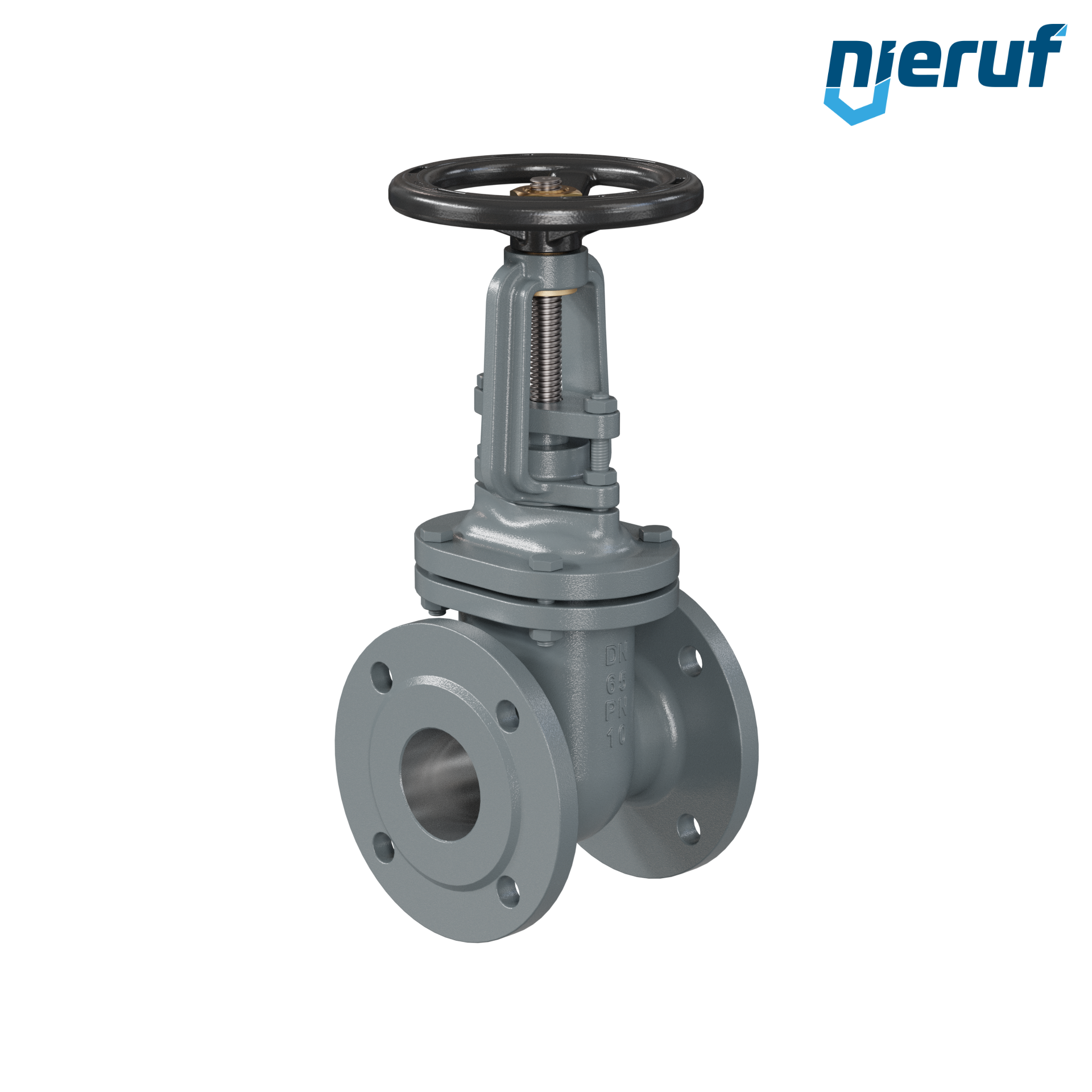 | Produktmerkmal | Keilflachschieber aus Grauguss in Durchgangsform mit Flanschanschluss und außenliegender Spindel sowie nicht steigendem Handrad. |