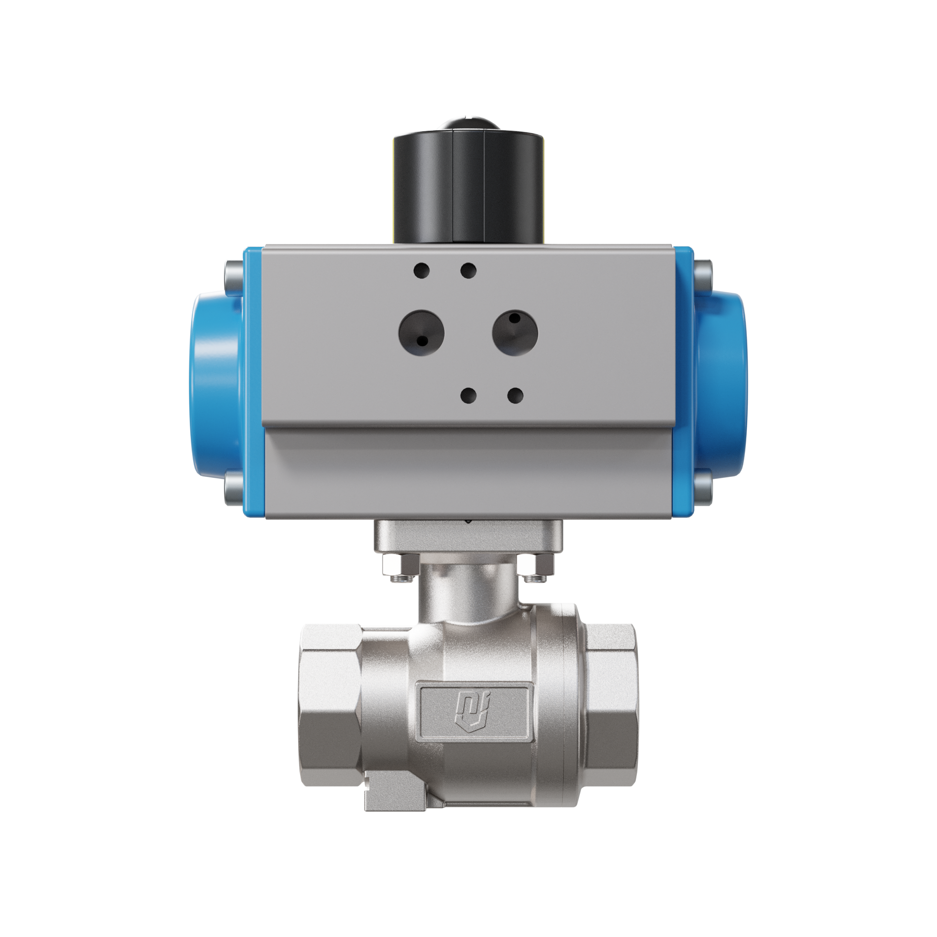 Für diesen hoch qualitativen Kugelhahn aus Edelstahl mit pneumatischem Drehantrieb (GD = doppeltwirkend) ist das Steuermedium des Antriebs gefilterte Druckluft.