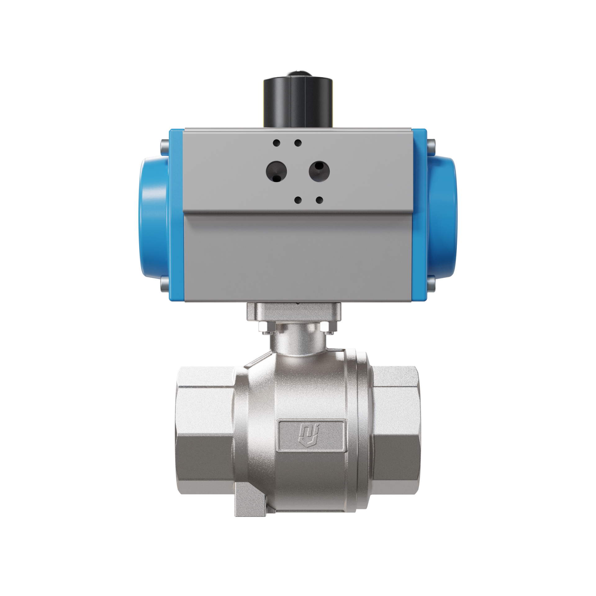 Für diesen hoch qualitativen Kugelhahn aus Edelstahl mit pneumatischem Drehantrieb (GD = doppeltwirkend) ist das Steuermedium des Antriebs gefilterte Druckluft.