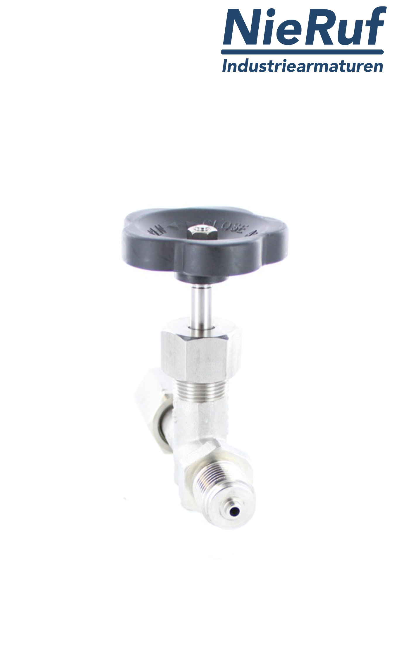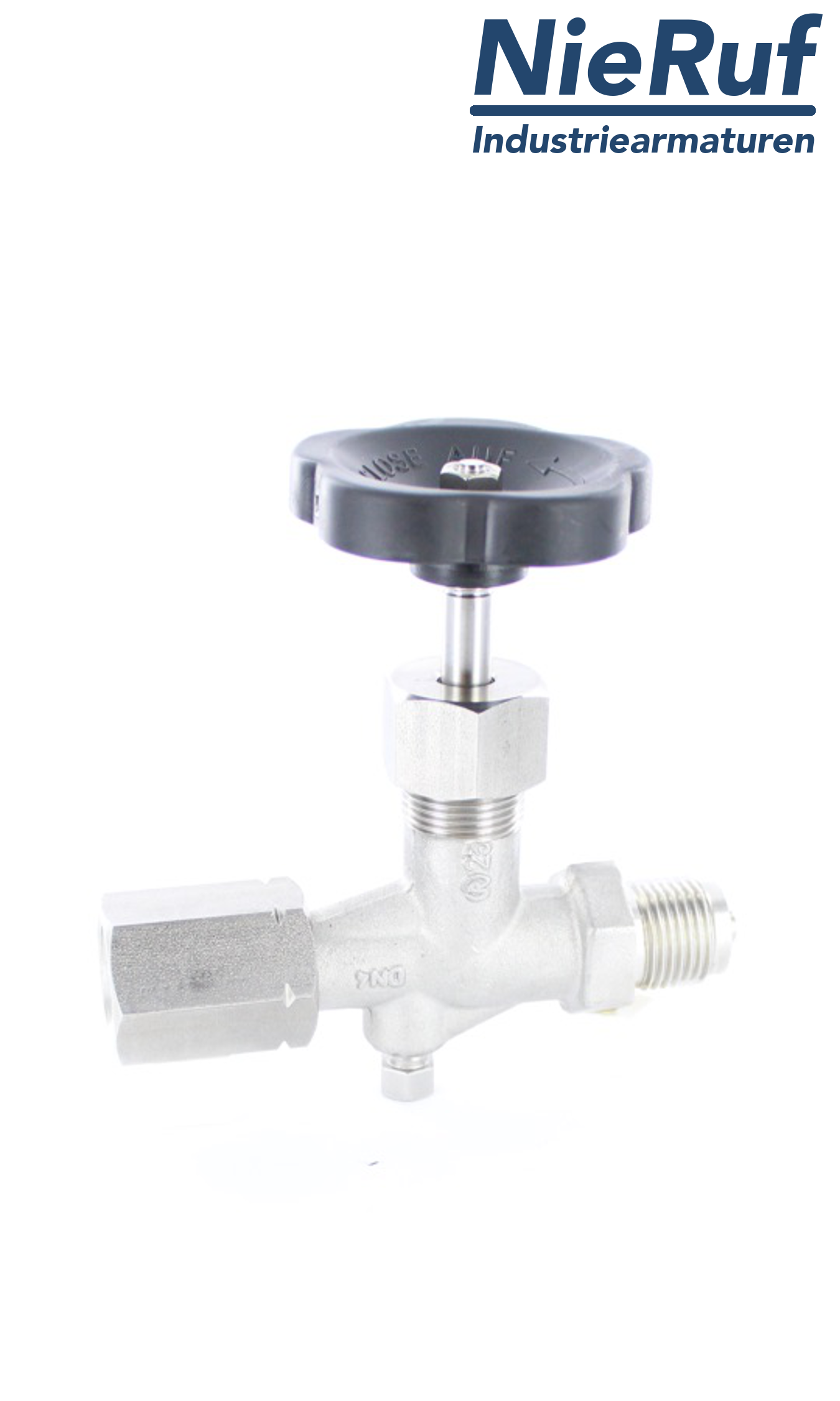 Manometer-Absperrventil DIN 16270 mit 1/2" Zoll Anschluss für bis zu 400 bar mit Zapfen x Spannmuffe aus Edelstahl 1.4571