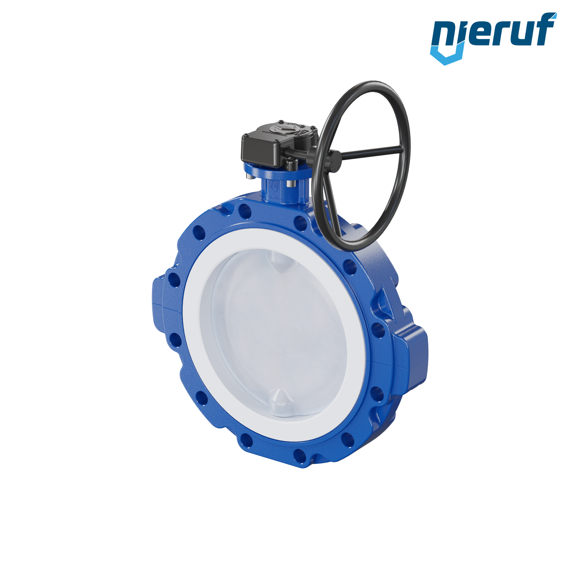 PFA-Absperrklappe DN350 ANSI150 mit Zentrieraugen mit Handradgetriebe Dichtung aus PTFE und EPDM Einlage für aggressive Medien