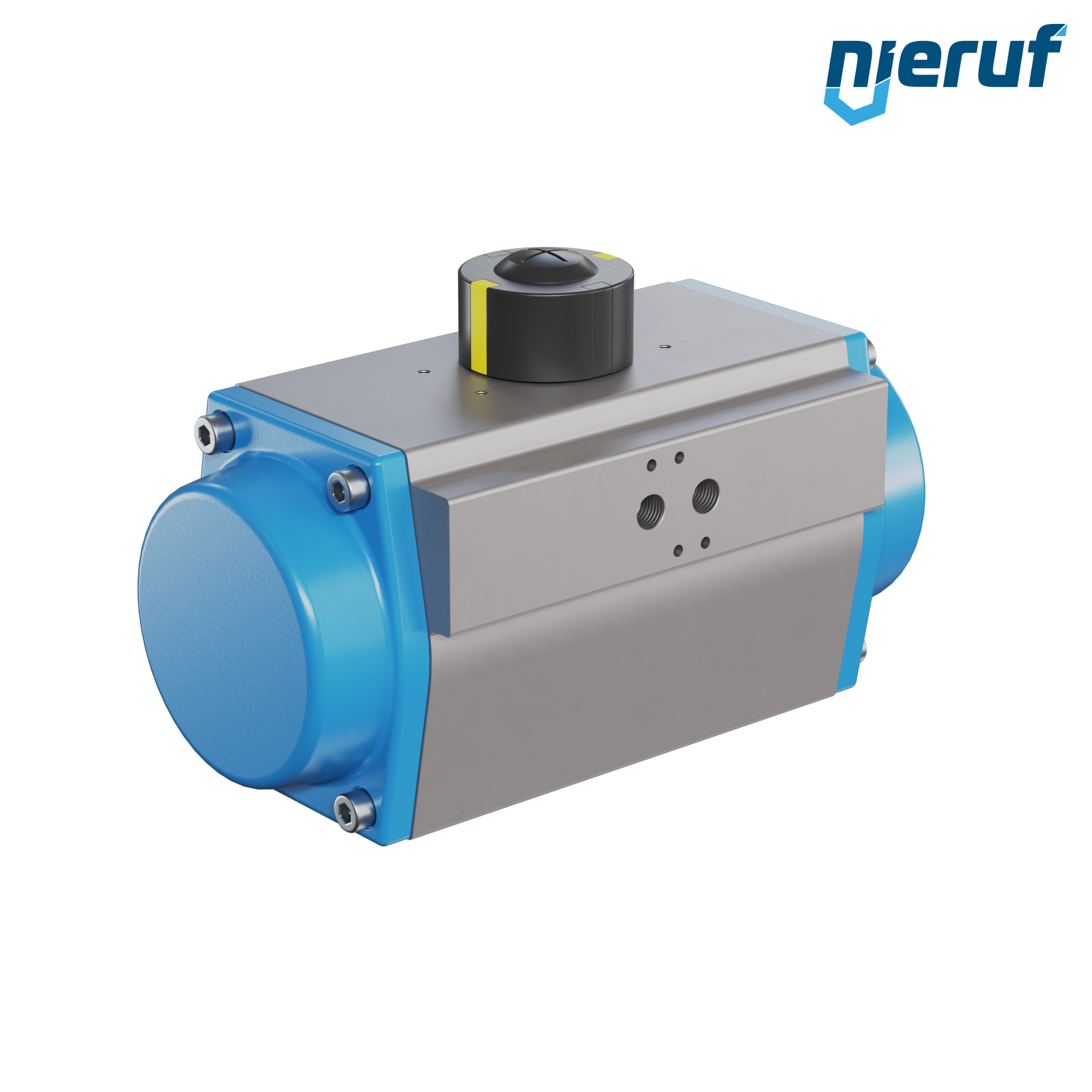 Kompakter, einfachwirkender, federkraftöffnender, pneumatischer Antrieb zum Steuern und Regeln von Armaturen. Voreingestellter Schwenkwinkel 90° mit optischer Stellungsanzeige.