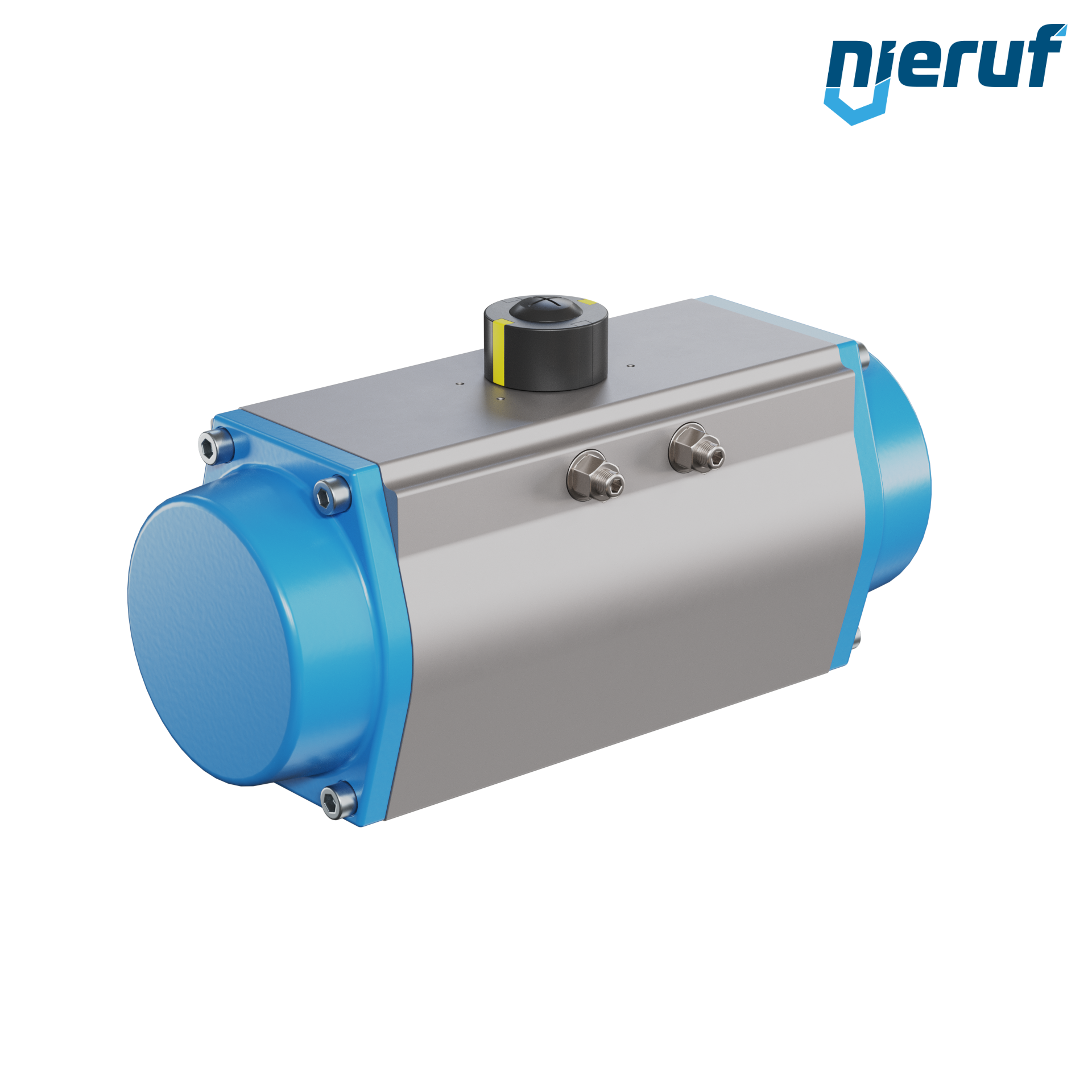 Kompakter, einfachwirkender, federkraftöffnender, pneumatischer Antrieb zum Steuern und Regeln von Armaturen. Voreingestellter Schwenkwinkel 90° mit optischer Stellungsanzeige. Hoch-Temperatur-Version.