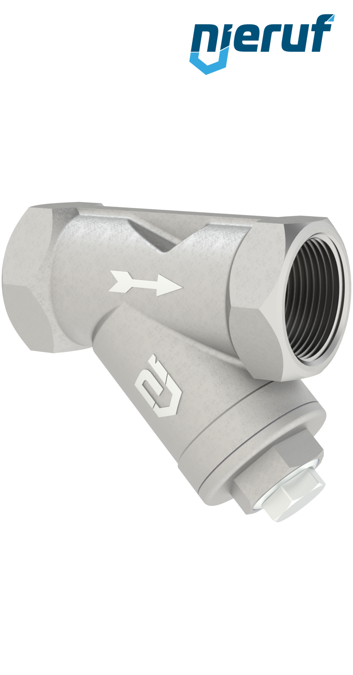 Gewinde-Schmutzfänger aus Edelstahl in Y-Bauart mit Verschlusstopfen und herausnehmbarem Edelstahlfilter, horizontaler oder vertikaler Einbau.
