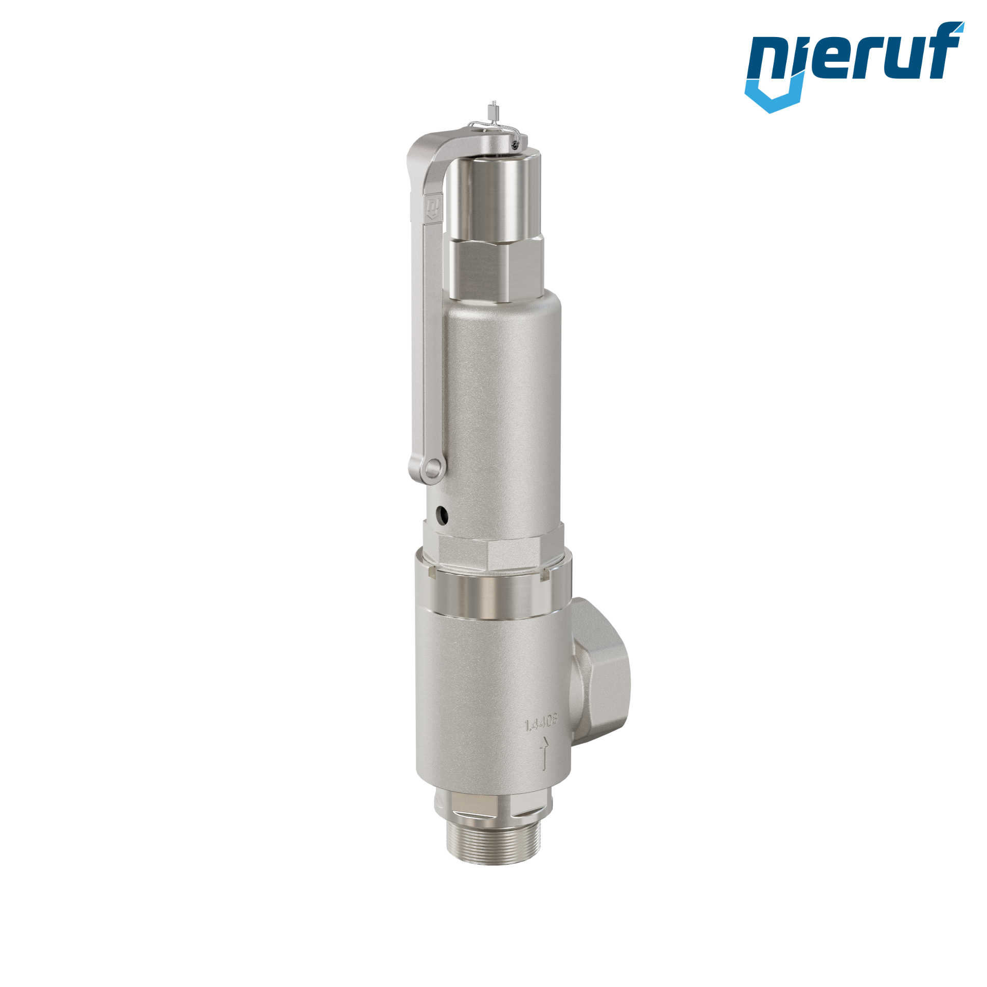 Edelstahl-Sicherheitsventil 1 1/2" AG x 2" IG PTFE Typ SV06 mit Aussengewinde BSP-P für flüssige Medien mit Hebel und Faltenbalg