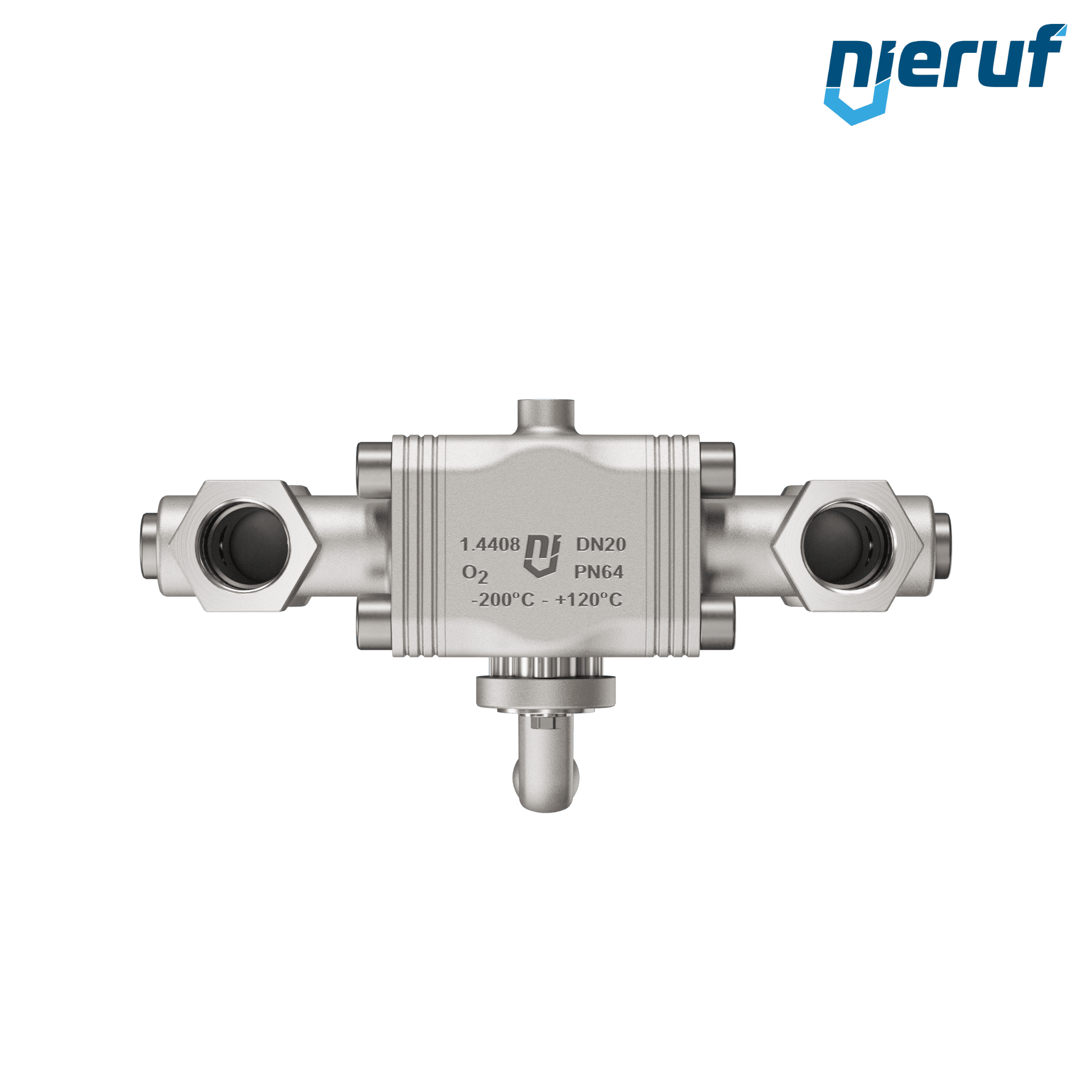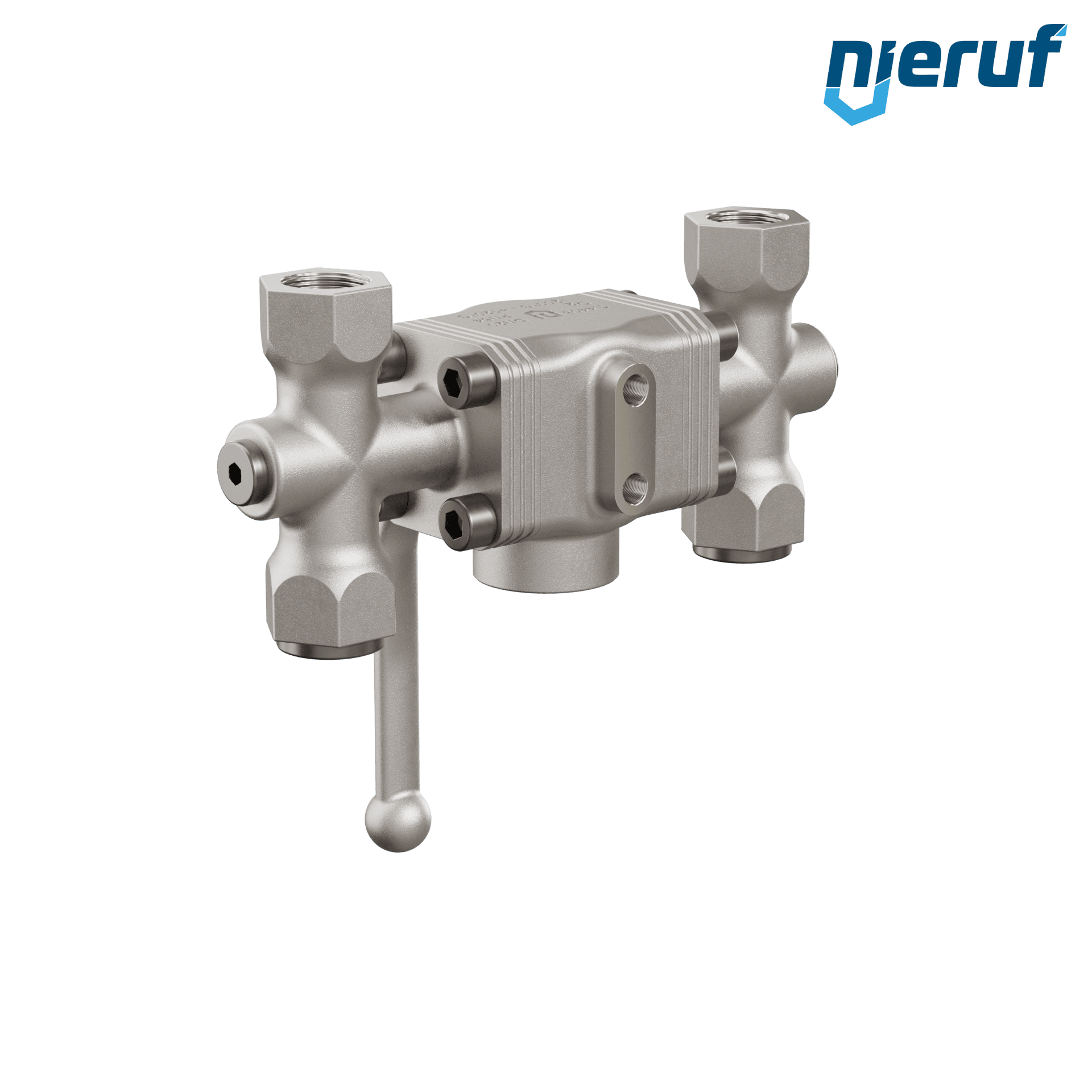 Wechselkugelhahn mit Gewindeanschluss aus Edelstahl für den Aufbau von zwei Sicherheitsventilen zur Absicherung von Behältern für die Lagerung von tiefkalten verflüssigten Gasen. Mit L-Bohrung.